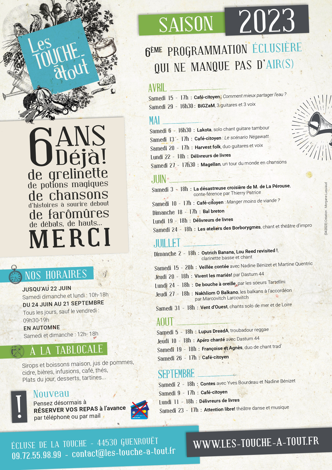 Niché au bord du canal de Nantes à Brest, Les Touche-a-tout est une halte pour les promeneurs du halage. Petite restauration à base de produits locaux, boissons fraîches et chaudes confectionnées sur place, en fonction de la cueillette du jour, spectacles et animations durant l’été… Un véritable havre de paix et d’échanges.